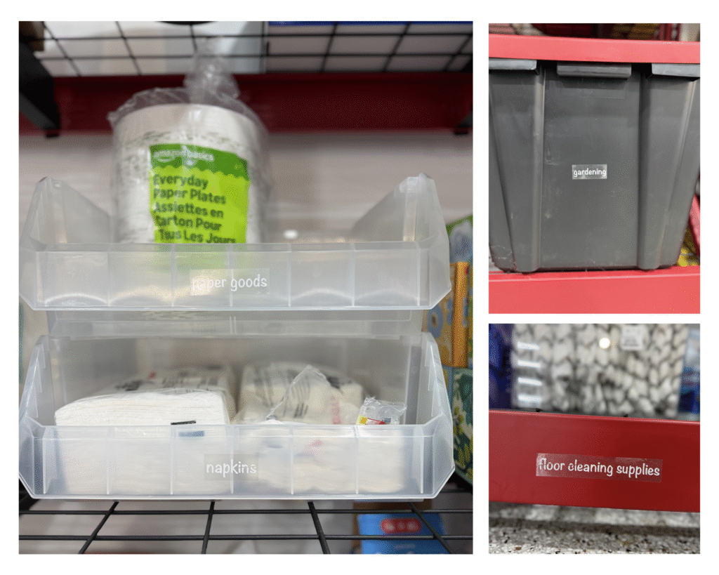 Firstly, I dedicated the shelves closest to the door to backstock like paper towels and cleaners. Now, she breezes through the unpacking process after a bulk shopping trip. Everything has a place and her husband and kids know where everything belongs.